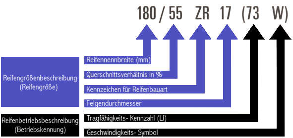 Reifenbezeichnungen werden die Reifenmaße, wie Reifenbreite,